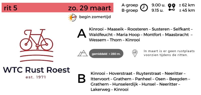 Hier vind je een overzicht van de vier eerstvolgende ritten van WTC Rust Roest Kinrooi.